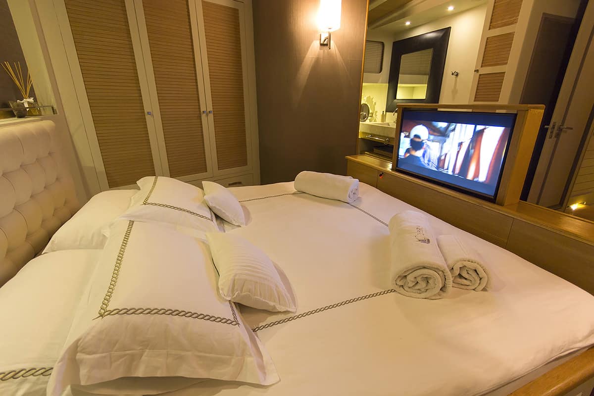 Mentioned crew consist of 6 members who will go an extra mile to provide you with everything you might need. Your personal chef will prepare all delicious meals and you can choose to dine at outdoor spaces for eating and relaxing or indoor in the saloon. The deck offers you a seating area, sun mattress for you to relax and enjoy in the sun and the fabulous views, as you cruise. Cobra King also provides a good sailing system, tender and full range of water sports.